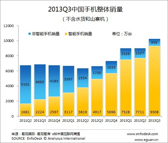 根據Enfodesk易觀智庫最新發(fā)布的《2013年第3季度中國手機市場監(jiān)測報告》顯示,3季度中國手機(不含水貨和山寨機)銷量為10266萬臺,環(huán)比增長13.6%,同比增長54.5%。其中,智能手機銷量為9308萬臺,環(huán)比增長率為20.7%,同比增幅更是高達89.3%。智能手機占整體市場份額持續(xù)上升至90.7%。