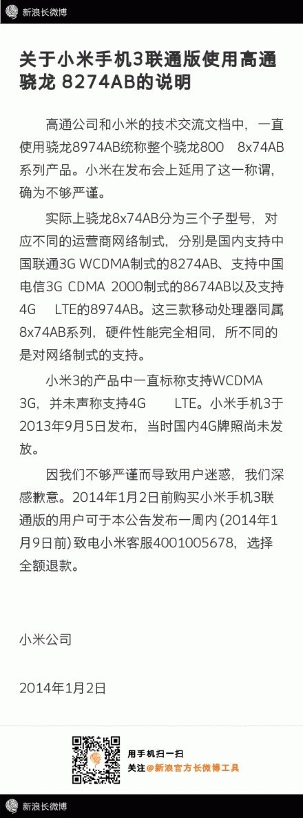 1月2日消息,針對(duì)網(wǎng)友有關(guān)小米手機(jī)3聯(lián)通版偷換CPU的質(zhì)疑,小米公司今天下午發(fā)布微博向用戶致歉,稱小米與高通一直使用驍龍8974AB統(tǒng)稱整個(gè)驍龍800 8x74AB系列產(chǎn)品,措辭上不夠嚴(yán)謹(jǐn),并接受2014年1月2日前購(gòu)買小米手機(jī)3聯(lián)通版用戶的全額退款。