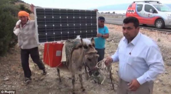 土耳其農(nóng)夫在驢背上放置太陽能電池板,在放牧?xí)r可采集太陽能為隨身攜帶的筆記本電腦和手機充電。