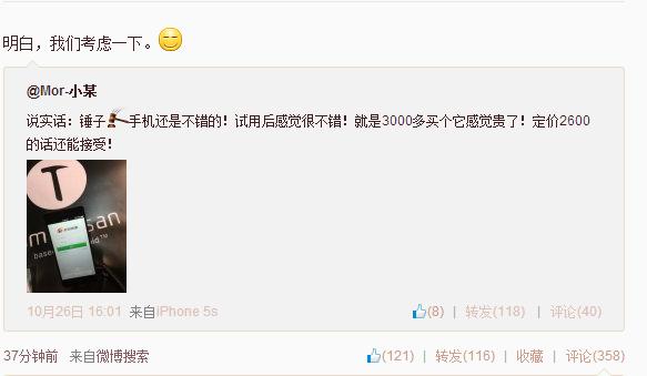 對此,部分用戶表示“老羅,你變了”,而買過的用戶也不希望降價,提醒羅永浩不妥協;也有用戶希望錘子手機便宜一些,“三千多的情懷確實有點貴”。