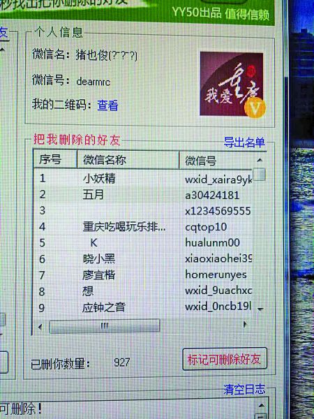 “原來我微信里躺著這么多‘尸體’。”昨日下午,草根微博大號“我愛重慶”陳泓宇也用該軟件對個人微信號“豬也俊”進行了測試,結果在3697位好友中,已有927位好友將他刪除。他忍不住自嘲:“為什么要刪我?大概是因為我刷屏、自拍和長得丑吧。”
