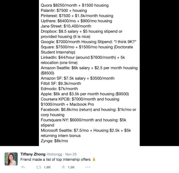 而從下圖(一個叫 Tiffany Zhong的Twitter網友披露出來的)可以看到現在更多科技巨頭給實習生開出的工資。這一數字已經比上述2月份Glassdoor的報告有所增長(或許是將津貼包含了進去)。比如Facebook的實習薪資為6800美元,外加1000美元的住房補貼。谷歌的為7000美元基本薪資外加住房津貼,可能達9000美元。蘋果的為6000美元,外加3500美元住房津貼。Quora的為8250美元,外加1500美元住房津貼。亞馬遜西雅圖為6000美元,外加2500美元住房津貼,亞馬遜舊金山為7500美元,外加3500美元住房津貼。連Fitbit這種新創公司也到了9300美元。
