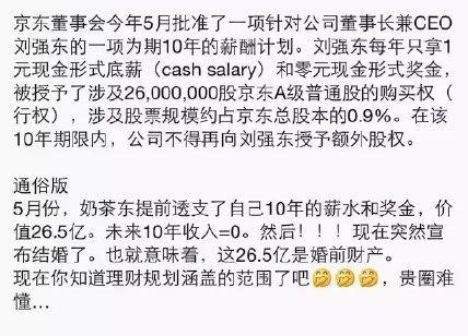 劉強東婚前財產年薪1塊錢 網友:赤果果的不信任