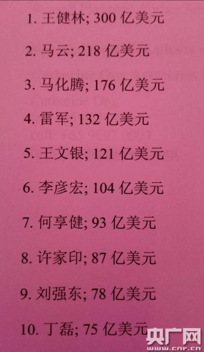 26日,《福布斯》雜志在京發(fā)布2015年福布斯中國(guó)富豪榜,萬(wàn)達(dá)集團(tuán)董事長(zhǎng)王健林勝過(guò)馬云,重回首富寶座 馬云由第一位跌至第二位,馬化騰則繼續(xù)維持第三位。前十位有6位來(lái)自互聯(lián)網(wǎng)行業(yè)。2015年福布斯中國(guó)富豪榜上前100名成員的財(cái)富總和從一年前的3760億美元增至4500億美元,增幅近20%。