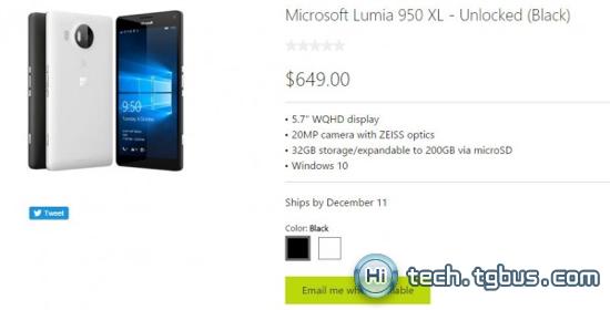 上周在官方在線商城開(kāi)啟了兩次預(yù)訂工作之后,今天早些時(shí)候微軟在美國(guó)地區(qū)正式發(fā)售Lumia 950 XL,在上線數(shù)小時(shí)之后這款旗艦機(jī)型宣布售罄。目前感興趣的用戶可以預(yù)留郵件地址,一旦到貨上線將會(huì)及時(shí)通知你。根據(jù)信息顯示所有Lumia 950 XL的訂單將于12月11日開(kāi)始發(fā)貨,而根據(jù)此前曝光的信息首批預(yù)訂用戶已經(jīng)開(kāi)始發(fā)貨了。