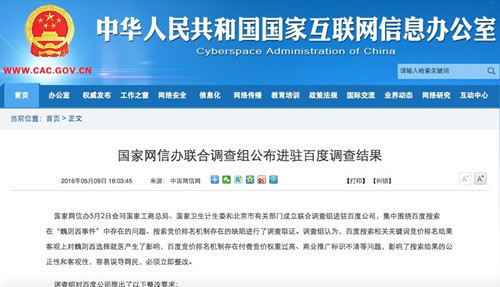 5月2日,國(guó)家網(wǎng)信辦會(huì)同國(guó)家工商總局、國(guó)家衛(wèi)生計(jì)生委和北京市有關(guān)部門成立聯(lián)合調(diào)查組進(jìn)駐百度公司,集中圍繞百度搜索在“魏則西事件”中存在的問(wèn)題、搜索競(jìng)價(jià)排名機(jī)制存在的缺陷進(jìn)行了調(diào)查取證。